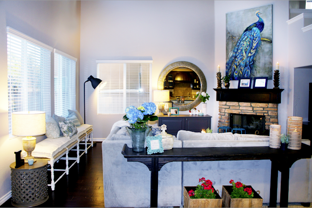 The previous homeowner had the sofa pushed up against the windows. It is always best to float furniture in a room. The window is too far away from the entertainment unit and it created a room that felt awkward and cold. By floating the sofa it is more intimate and you get the added bonus of extra seating below the window.